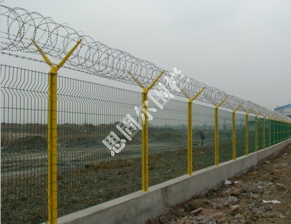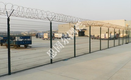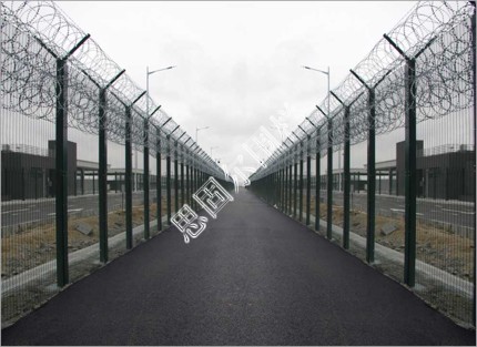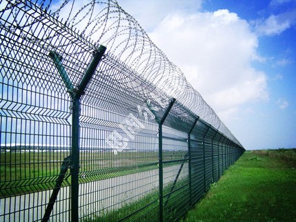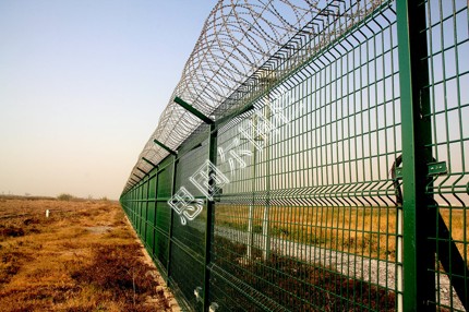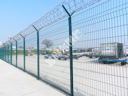 注:如果在飛機場圍欄頂部加裝刀片刺絲、刀片刺繩后又很好的增強了安全防護性能。采用電鍍、熱鍍、噴塑、浸塑等防腐形式,具有很好的抗老化、抗曬、耐候等特點。其產(chǎn)品造型美觀、花色多樣,既起到圍欄作用,又起到美化作用。由于具有安全性高、防攀爬能力好,網(wǎng)片連接方式采用特制SBS緊扣件,有效防止人為的破壞性拆卸,橫向四道折彎加強筋,使網(wǎng)面強度顯著增加。