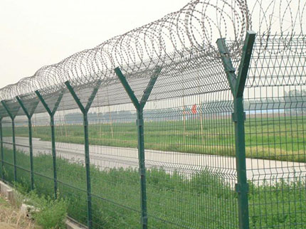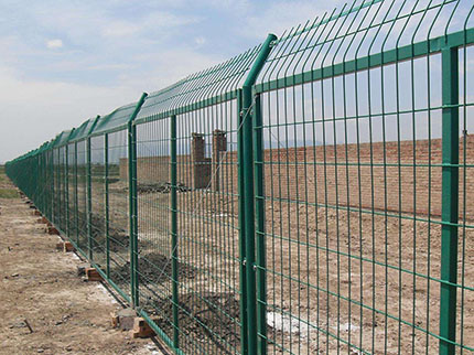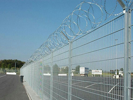 軍事基地防護網(wǎng)外觀尺寸為1700×3000mm(立柱中心距),邊框采用30×50×2.0mmd的矩管制成,網(wǎng)片由直徑為4mm的鋼絲焊接,網(wǎng)孔75×150mm,立柱用40×40×2.5mm的方管制成。立柱、網(wǎng)片鏈接板采用90°折角,厚度4mm鋼板制成,金屬網(wǎng)應進行鍍鋅后防腐浸塑處理,防護柵欄安裝做到“嚴、直、齊、美”,線路封閉嚴實,不留間隙;沿線路方向順直,不忽遠忽近;防護柵欄頂端和下端縱向過渡平滑整齊,不忽高忽低;要求整體效果美觀,避免給人凌亂感覺。安裝前應平整場地,柵欄底部距離地面高度按10cm設計,不滿足時,應進行回填處理。
